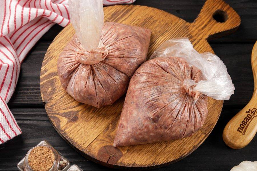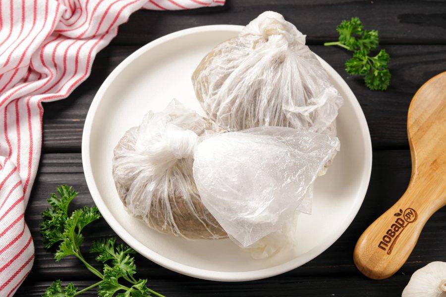 Возьмите обычный полиэтиленовый пакет и выложите в него массу. Можно разделить для удобства на два пакета, можно на один. Выпустите из пакета весь воздух и крепко завяжите.