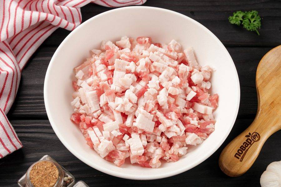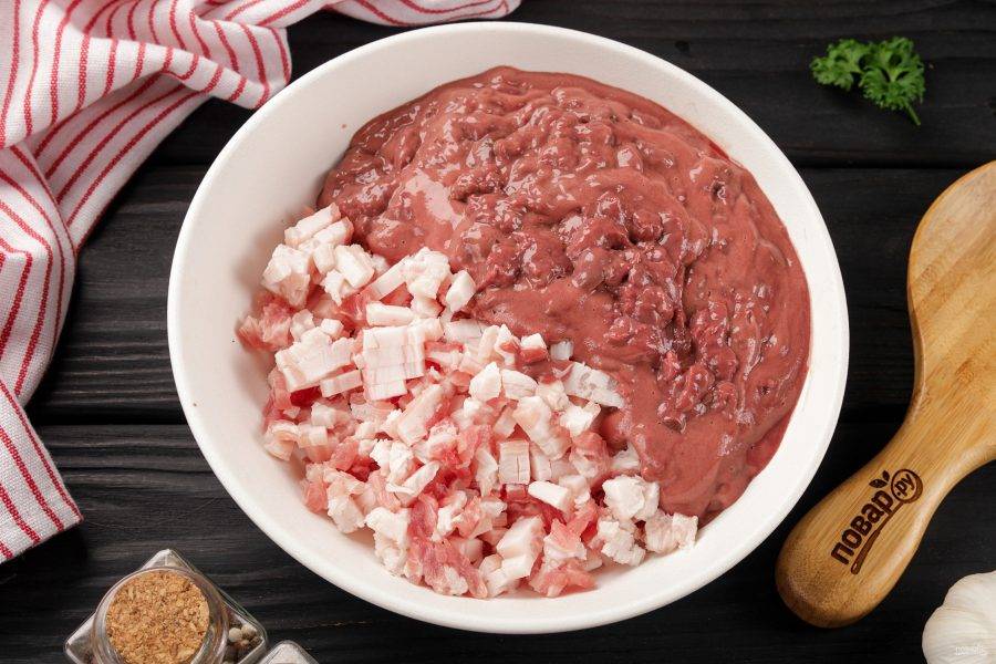 Если печень подмороженная, её тоже нарежьте примерно такими же кубиками. Если у вас печень охлаждённая, как у меня, то можете пропустить её через мясорубку с крупной решёткой.