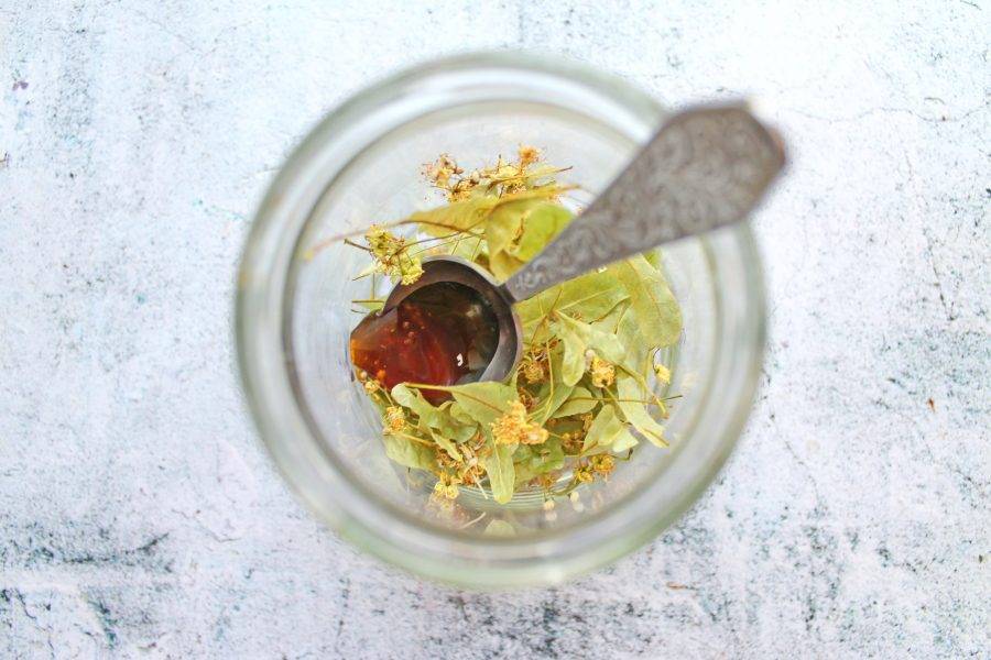 В сухую чистую банку выложите подготовленные цветки липы и добавьте мед.
