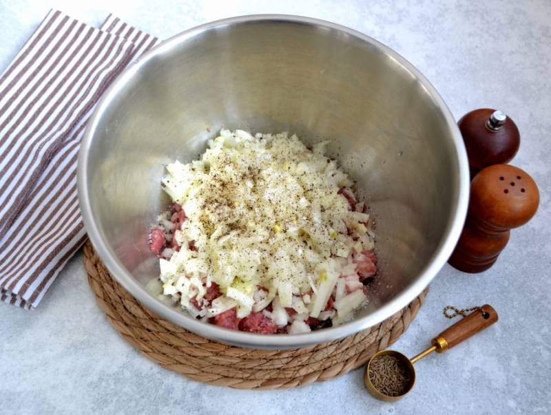 В миску выложите подготовленную свинину и лук, посолите и поперчите по вкусу. Добавьте зиру, прежде чем всыпать зиру в начинку, разотрите ее между ладоней.
