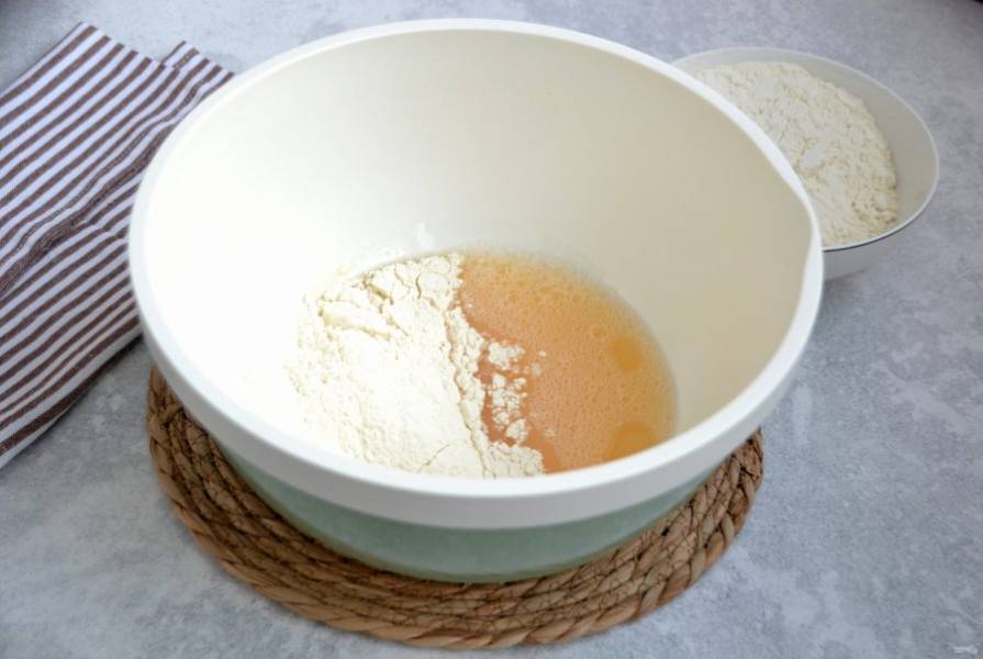 Постепенно всыпайте муку и смешивайте ее с жидкими ингредиентами.
