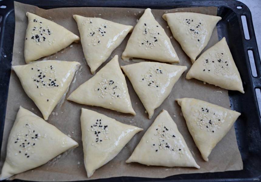 Сформируйте треугольный пирожок — самсу, тщательно защипните края, особенно центр, чтобы при выпекании не вытекал сок. Выложите на противень «швом» вниз.