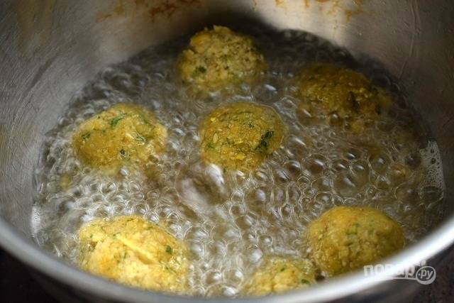 Затем мокрыми руками сформируйте 20 шариков, величиной с грецкий орех. Обжарьте их в раскаленном масле по 3-4 минуты до румяной корочки со всех сторон.