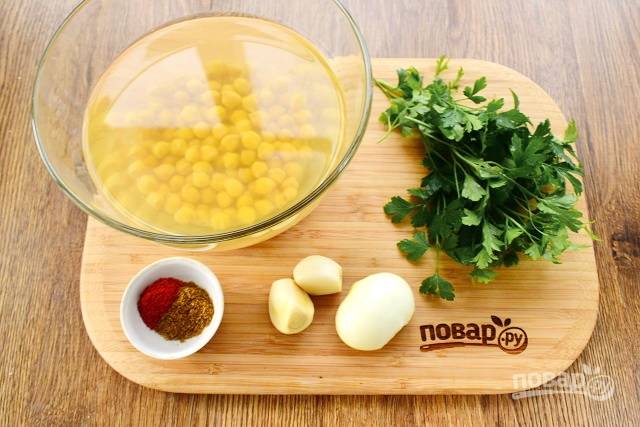 Нут замочите в в 1 л воды на несколько часов, лучше всего на ночь, слейте воду, очистите от пленок. Лук, чеснок помойте и очистите, измельчите.