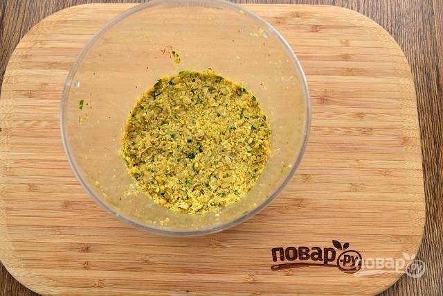 Нут измельчите в блендере, добавьте измельченную зелень, лук и чеснок, соль, перец, кардамон, муку и разрыхлитель, перемешайте. Если масса осталась сухой, влейте 2-3 ст. л. воды. Переложите в миску и отставьте на 30 минут.