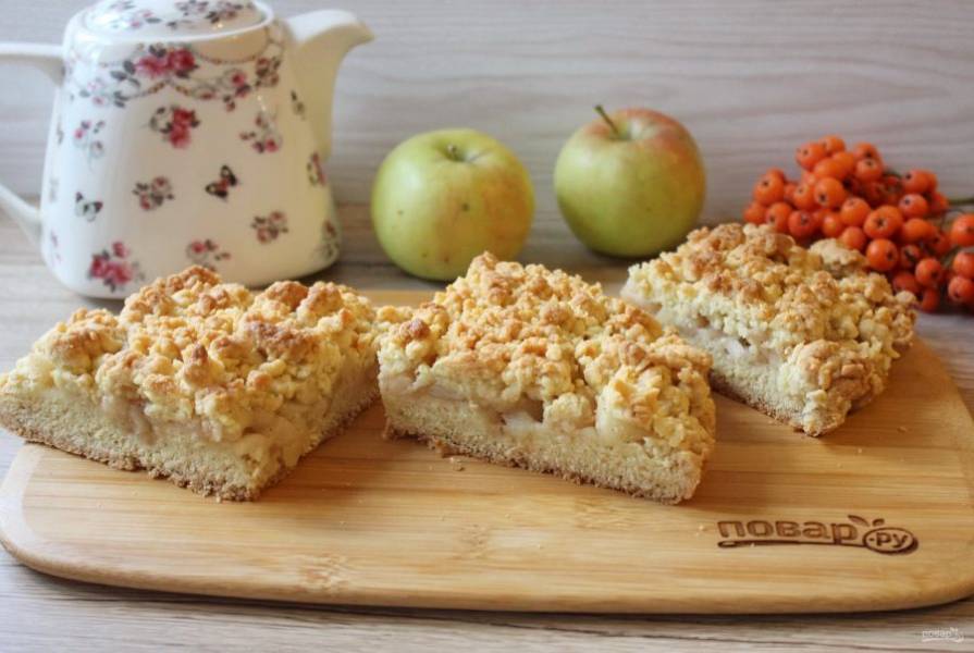 Поверх яблок выложите вторую половину крошки и разровняйте.