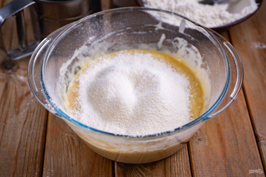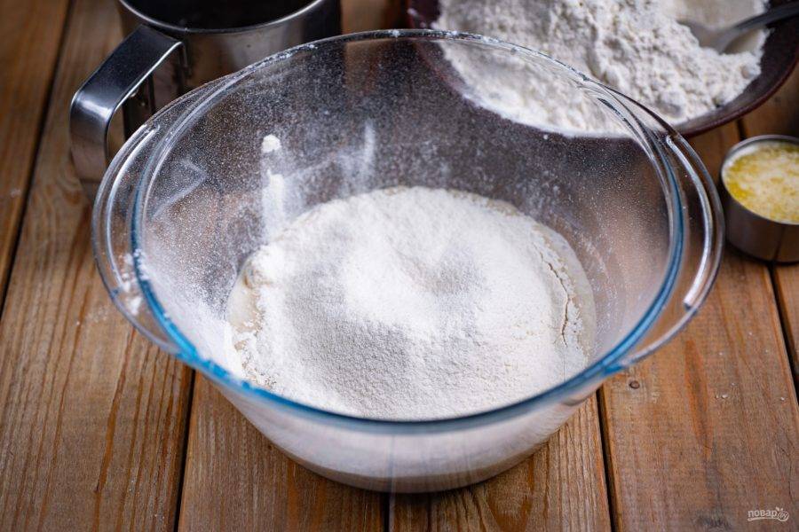К этой дрожжевой смеси просейте 100 грамм муки.