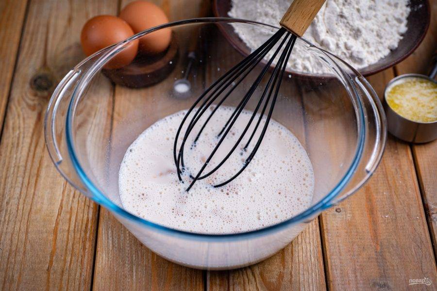 Залейте теплое молоко и активно венчиком размешайте эти ингредиенты до растворения сахара и дрожжей.