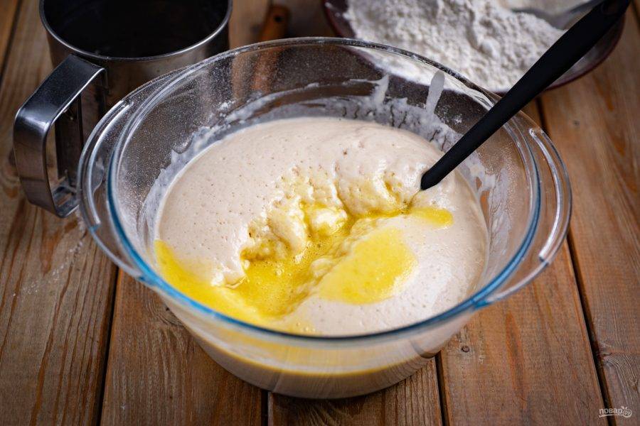 Опара к этому моменту уже подошла, то есть она заметно поднялась. Добавьте к опаре яичную смесь и вмешайте ее ложкой.