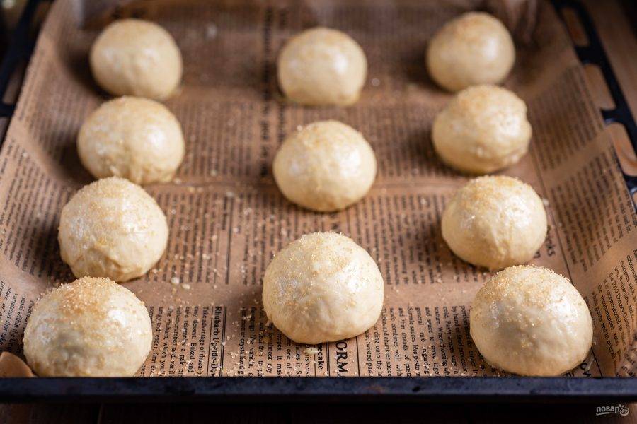 Эти шарики теста я выложила на противень, застеленный пергаментом, оставила на 15 минут в покое, накрыв кухонным полотенцем. Затем смазала взболтанным яйцом, присыпала коричневым сахаром и отправила в заранее разогретую до 180 градусов духовку на 15 минут.