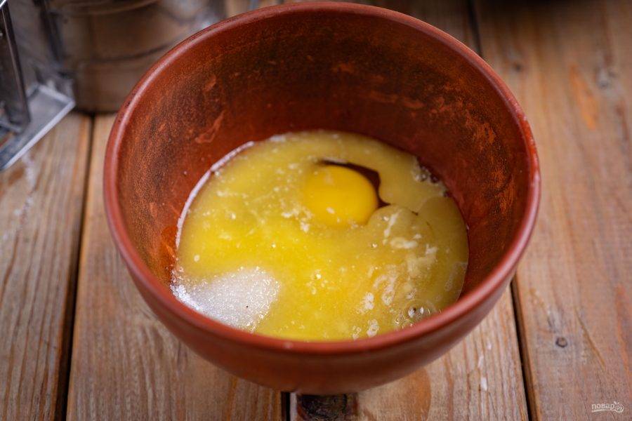 В отдельную миску вбейте яйца, добавьте оставшийся сахар, залейте растопленное масло. Перемешайте все венчиком до получения однородной смеси.
