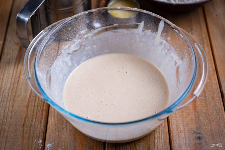 Вмешайте ее и у вас должна получиться смесь по консистенции, как блинное тесто — это опара. Миску с опарой накройте кухонным полотенцем и оставьте на 30 минут в покое.