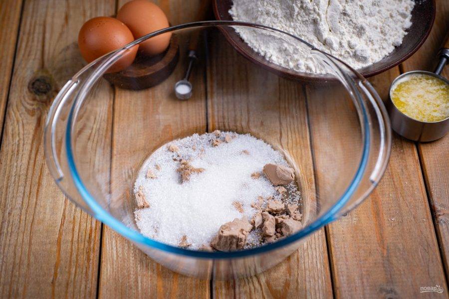 В просторную миску разотрите пальцами кусочек свежих дрожжей и к ним добавьте столовую ложку сахара.