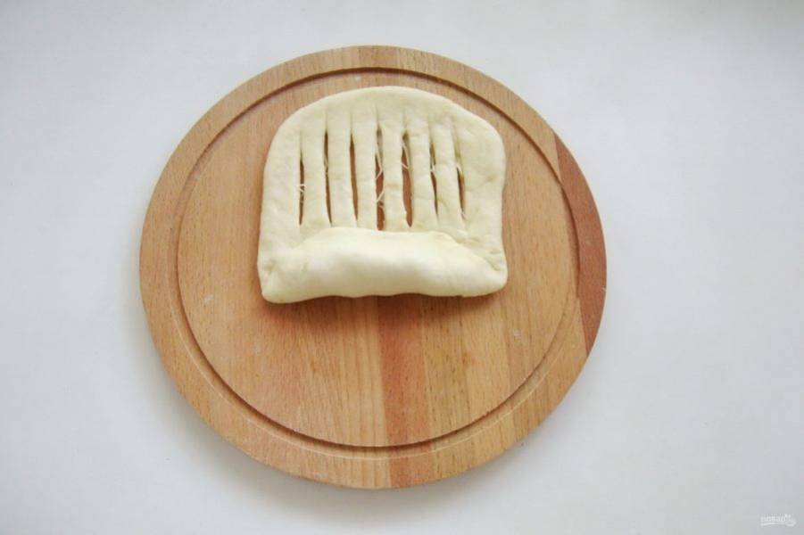 Достаньте тесто из миски, обомните и разделите на 6-7 частей. Каждую часть раскатайте в пласт. Сделайте надрезы, как на фото. Абрикосы помойте, удалите косточки и нарежьте небольшими кусочками. Выложите на тесто.