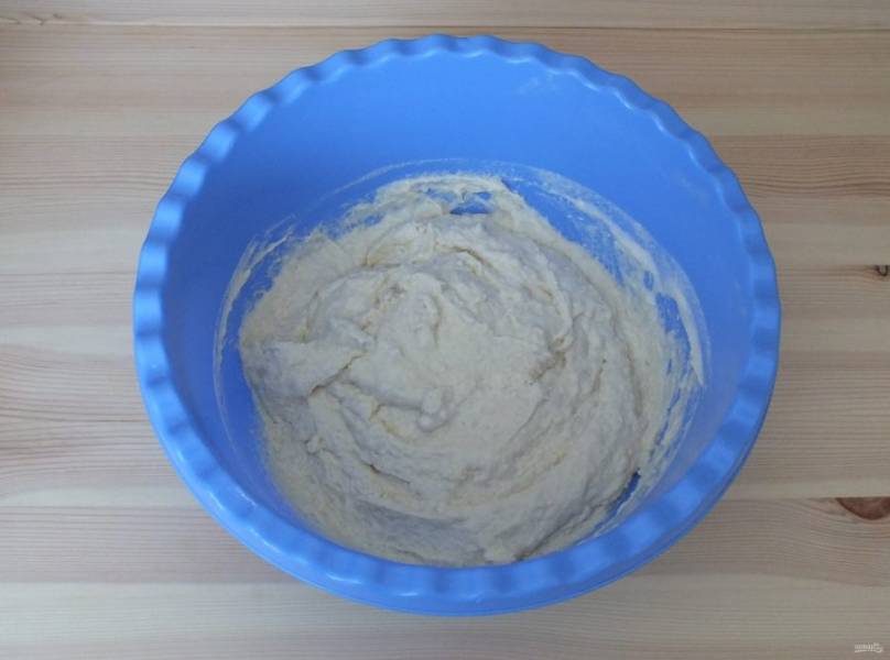 Получится вязкое тесто. В него всыпайте порциями оставшуюся муку и замешивайте тесто. Оно должно получиться мягким и податливым.