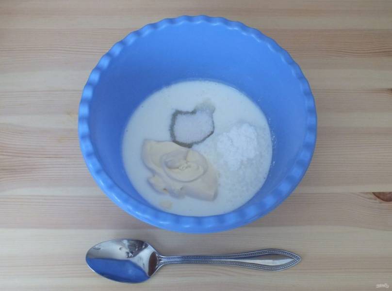В чаше смешайте кефир, сахар, соль, разрыхлитель для теста, майонез.
