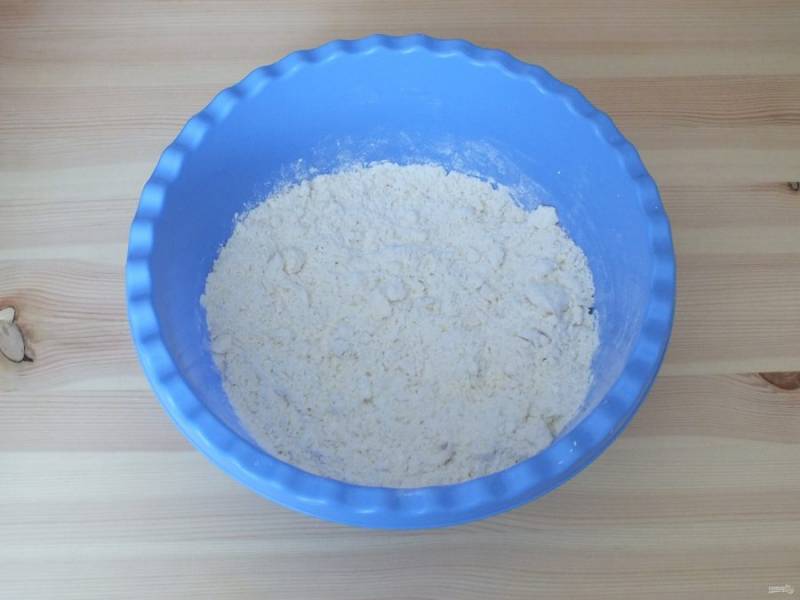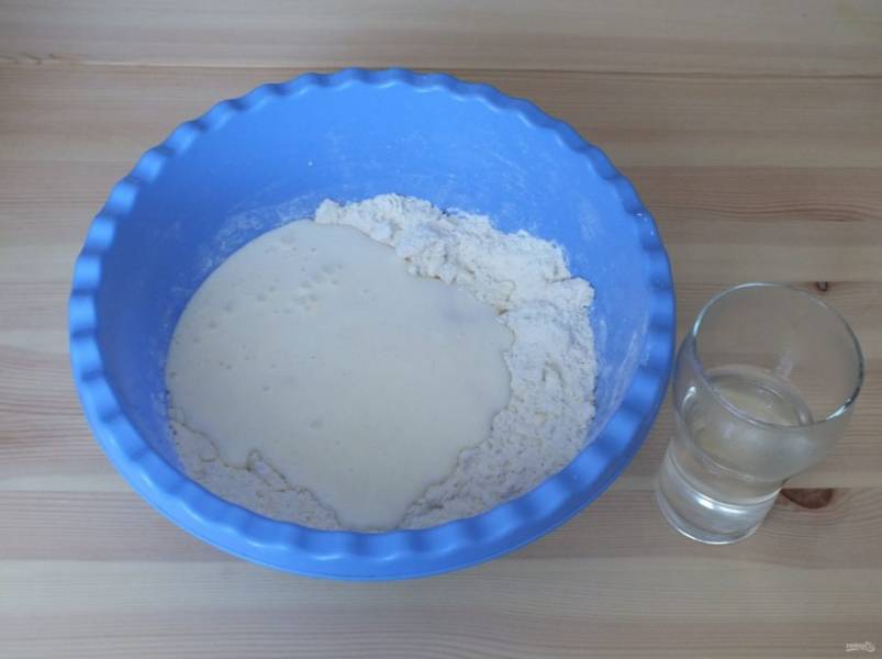 В чашу с мукой и маслом вылейте кефирную массу. Размешайте и вылейте 0,5 стакана горячей воды.