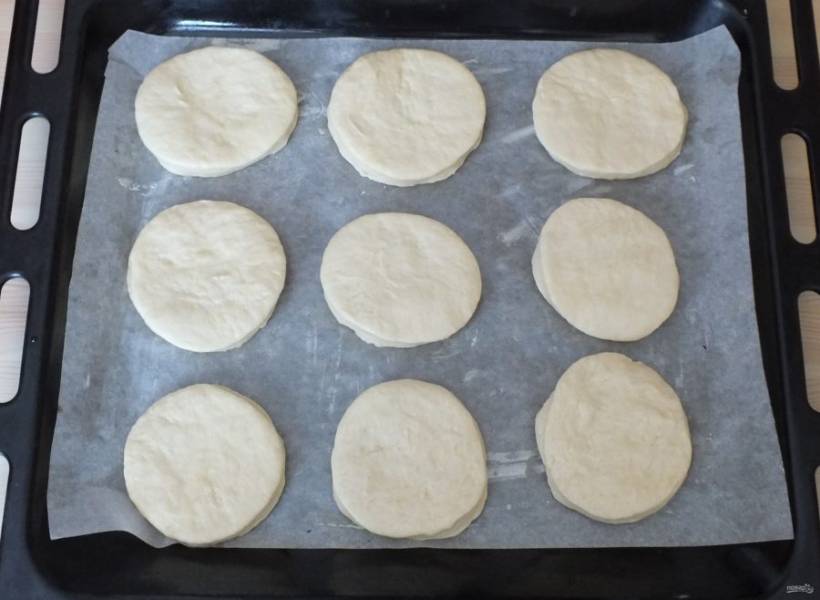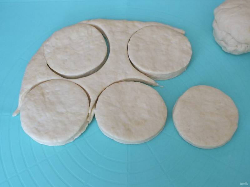 По истечении времени раскатайте пласт толщиной 1 см. Вырубкой или стаканом нарежьте лепешки. Используйте все тесто.