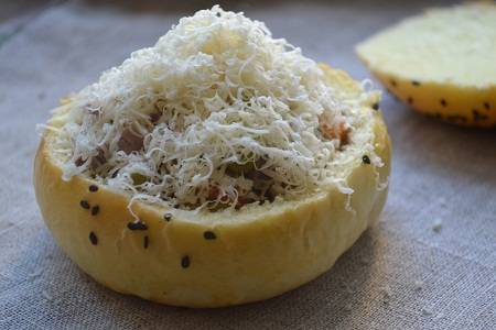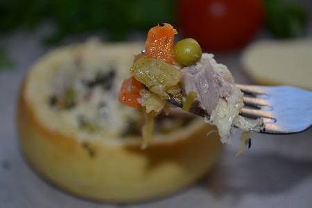 Отрезаем "крышку" и вынимаем мякоть. Выкладываем рагу.