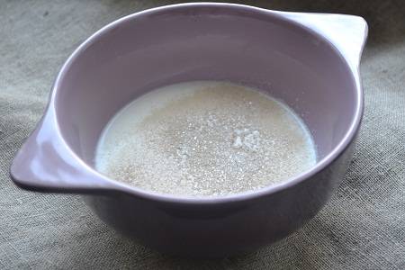 В теплом молоке растворить дрожжи и щепотку сахара.