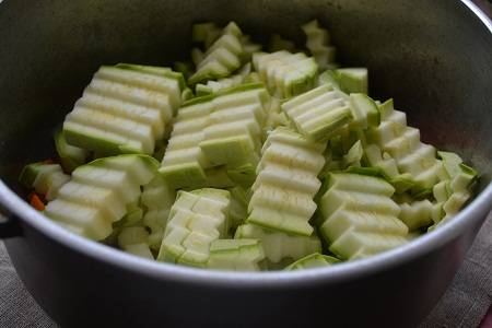 Соломкой (Можно в произвольной форме) нарезаем кабачки.