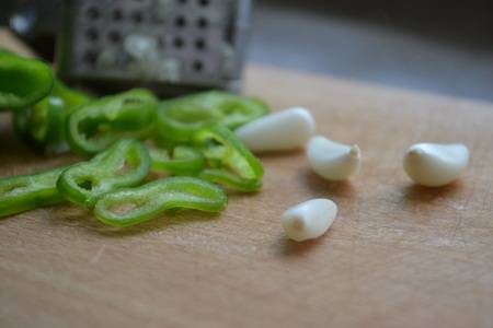 Нарезаем острый перец и чеснок.