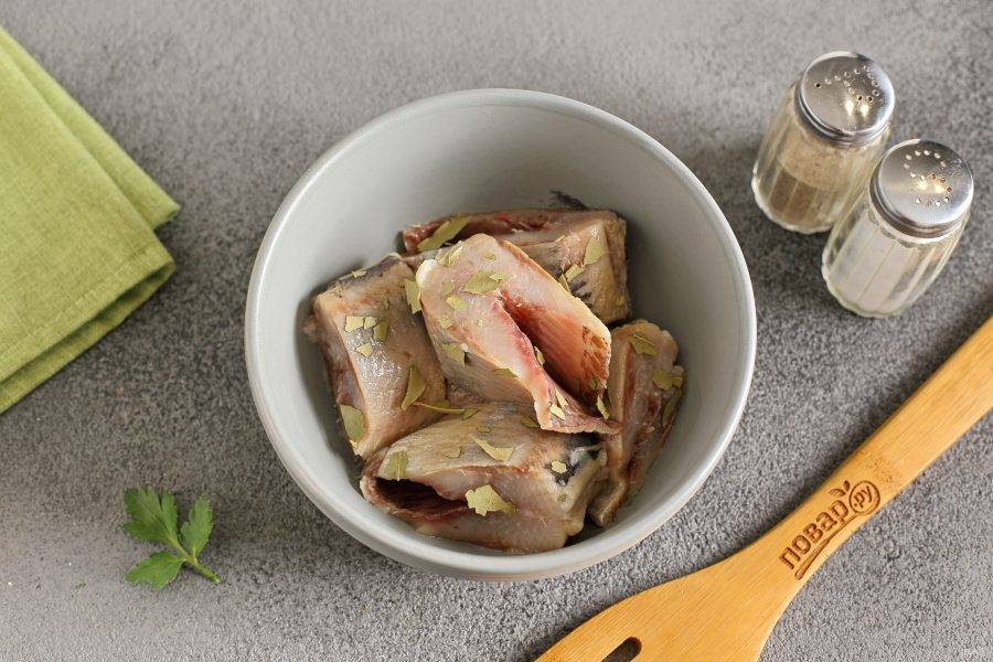 Сельдь промойте водой, отрежьте голову, хвост и плавники. Удалите внутренности и снимите шкурку. Промойте сельдь еще раз и нарежьте порционными кусочками.