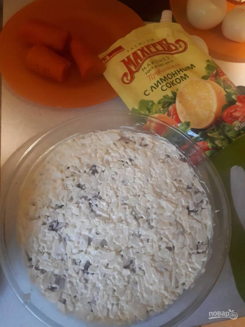 Предварительно отвариваем картошку, морковь, свеклу, яйца. Выкладываем слои: 1 слой - натертый отварной картофель аккуратно распределить по дну емкости. 2 слой - мелко нарезанная селедка. 3 слой - мелко нарезанный лук. Каждый слой равномерно промазываем майонезом "Махеевъ" с лимонным соком.