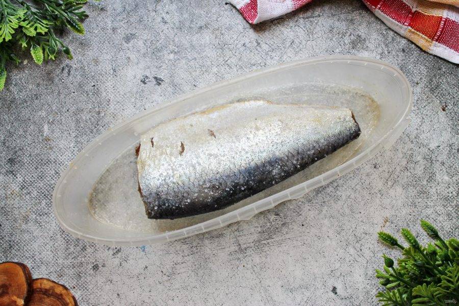 Возьмите половину соли, посыпьте немного дно посуды, где будете солить селедку. Остальную соль вотрите внутрь и снаружи. Выложите рыбу в посуду.