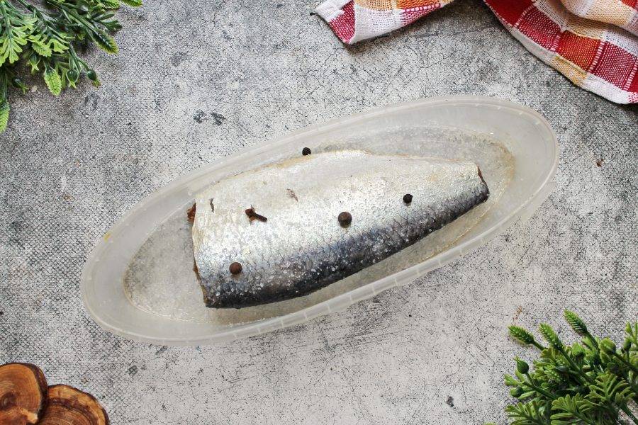 Слейте из посуды получившуюся жидкость. Снова посыпьте дно и сельдь оставшейся солью.