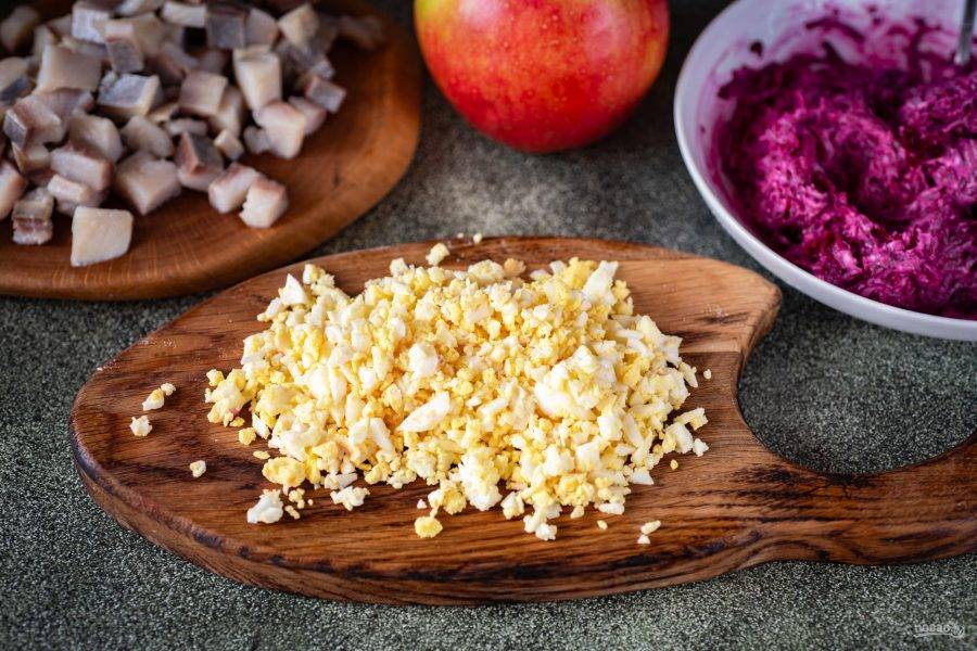 Отваренные яйца охладите, почистите от скорлупы и мелко нарежьте или натрите на мелкую терку.