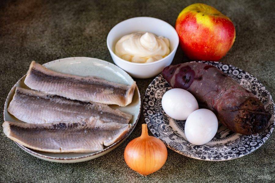 Все указанные ингредиенты очень удобно сразу же подготовить перед началом приготовления. Яблоко помойте. Свеклу отварите до мягкости. Лук почистите.