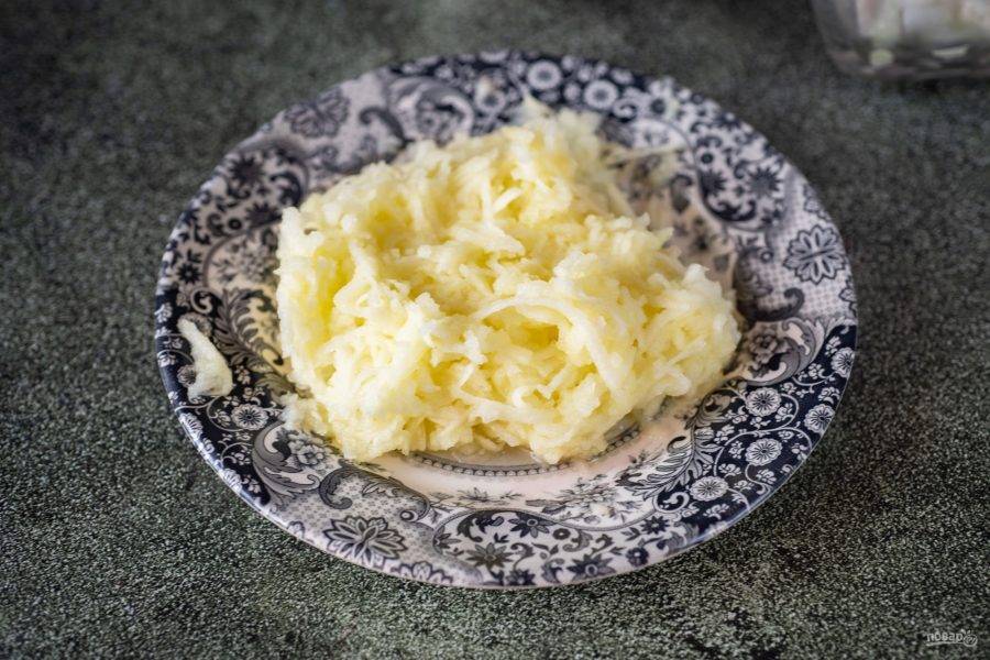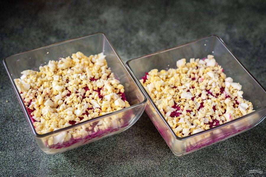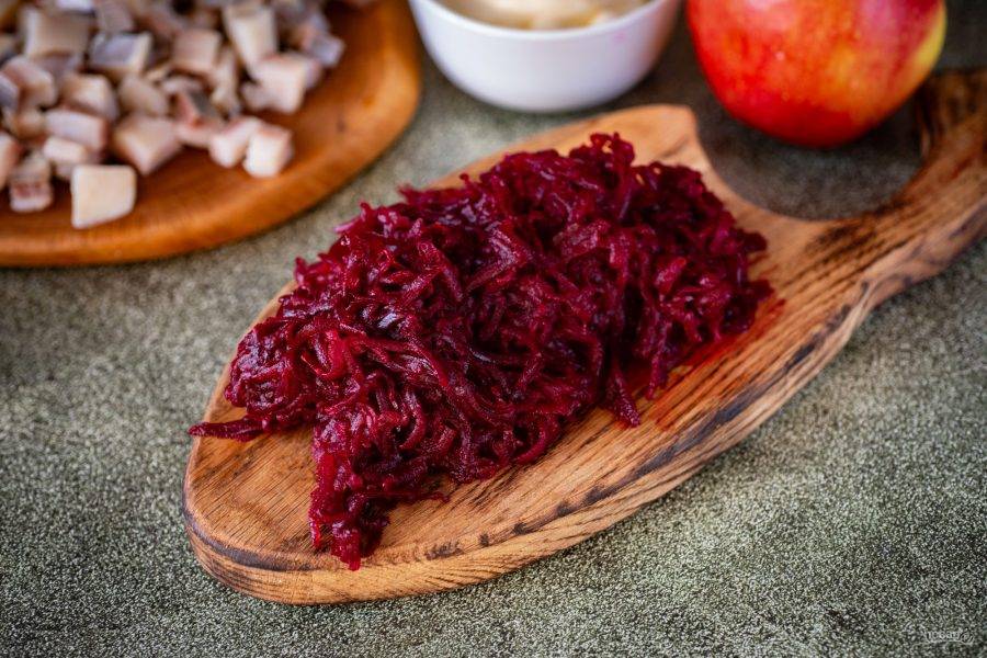 Отваренную свеклу почистите и натрите на крупную терку. Свеклу по возможности отожмите руками. Это необходимо сделать, чтобы ваш готовый салат не «поплыл».