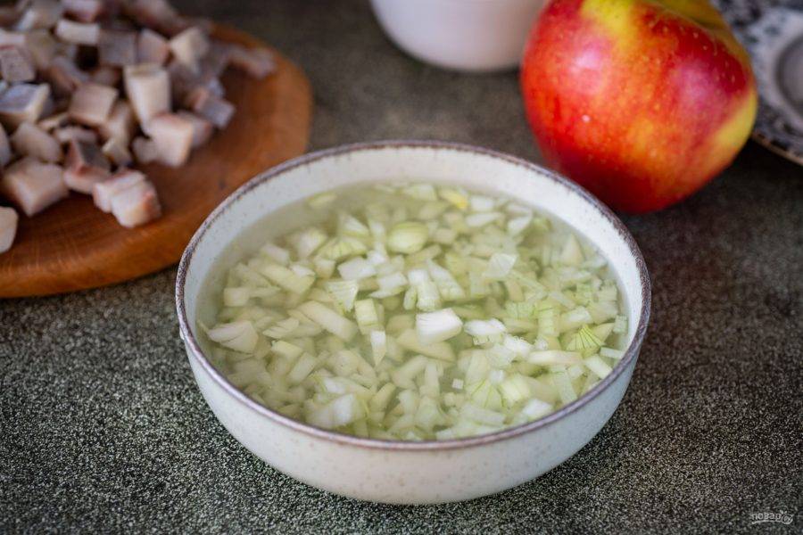 Начинайте собирать салат. Выберите удобный салатник — я использую два небольших стеклянных салатника. Первый слой — это кусочки селедки. Поверх выложите слоем ошпаренный лук.
