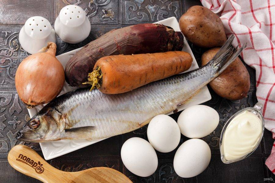 Подготовьте все ингредиенты по списку. Овощи и яйца отварите заранее. Дайте остыть. Селёдку можете взять в виде готового филе. У меня рыба целиком.