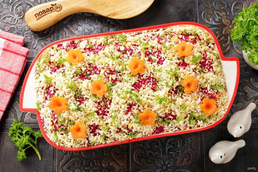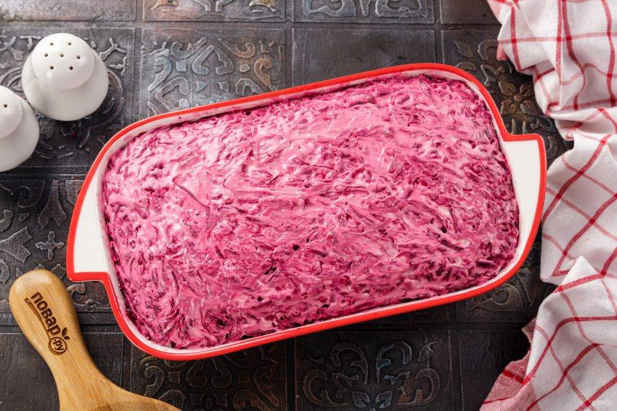 Последним слоем идёт свекла. Посолите и смажьте свеклу майонезом.