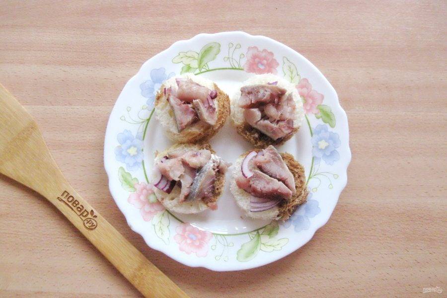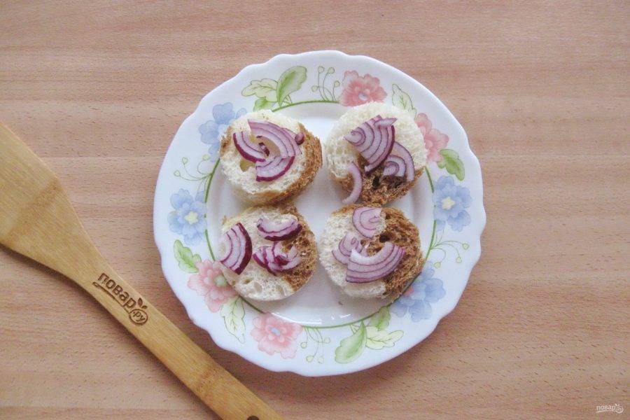 На каждый кружок хлеба выложите немного нарезанного лука.