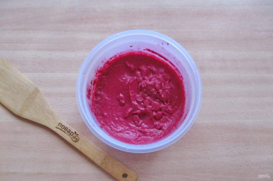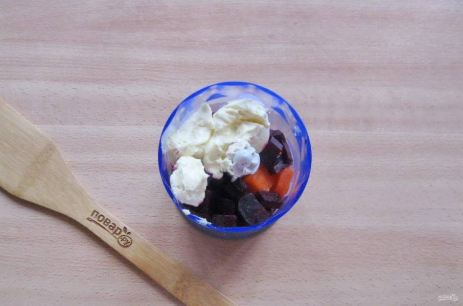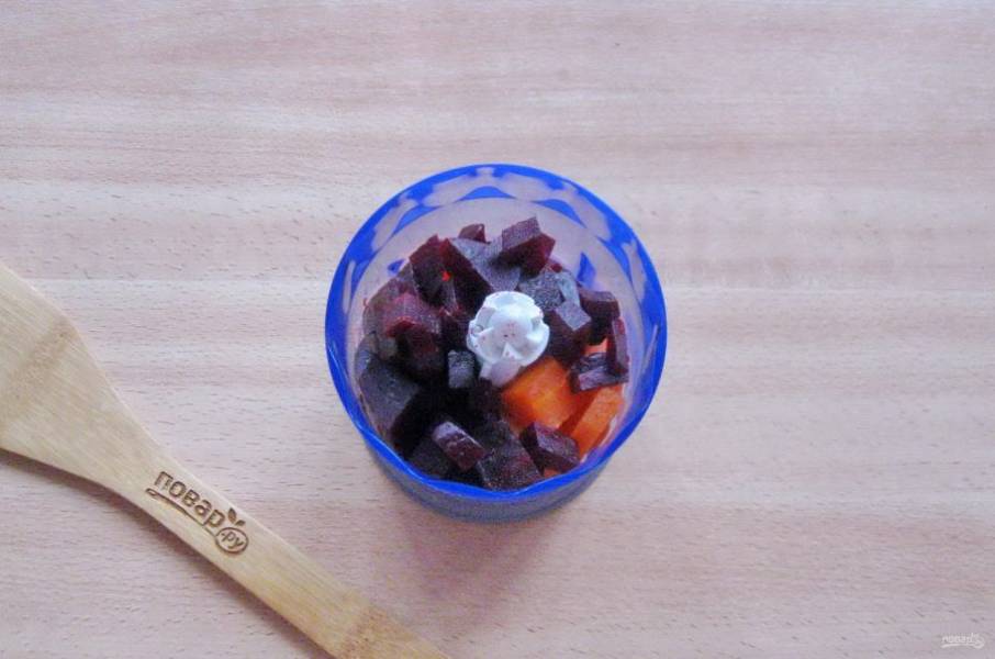 С помощью блендера взбейте отварную морковь, свеклу и сливочный сыр до однородной, кремовой консистенции. Посолите по вкусу. Получился свекольный мусс. Поставьте пока его в холод на 20 минут.