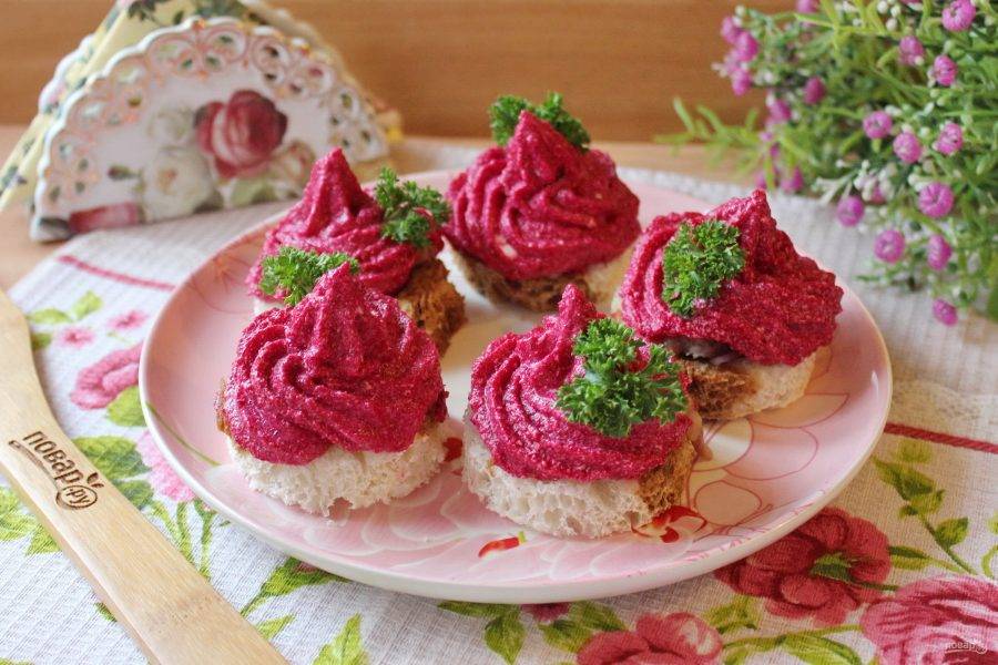Приготовленным муссом из моркови, свеклы и сливочного сыра заполните кулинарный мешок с насадкой. Отсадите мусс на хлеб с луком и сельдью.