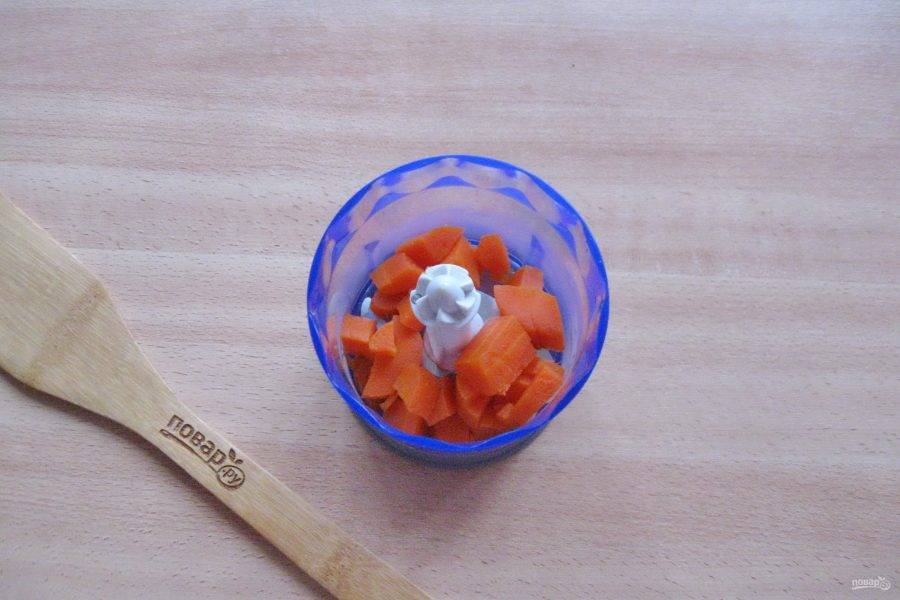 Морковь сварите, охладите, очистите, нарежьте произвольно и выложите в чашу блендера или измельчителя.