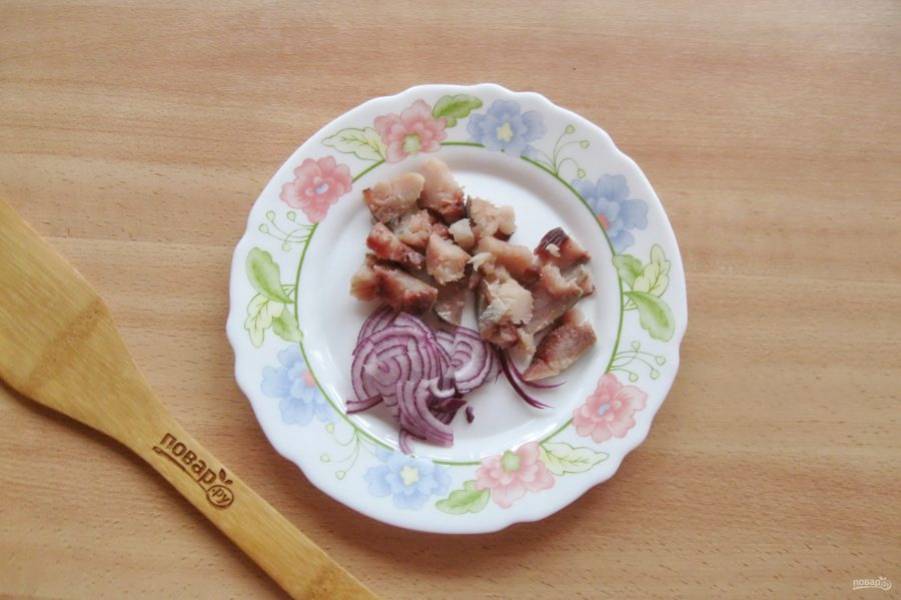 Филе сельди нарежьте небольшими кусочками. Красный лук очистите, помойте и нарежьте полукольцами.
