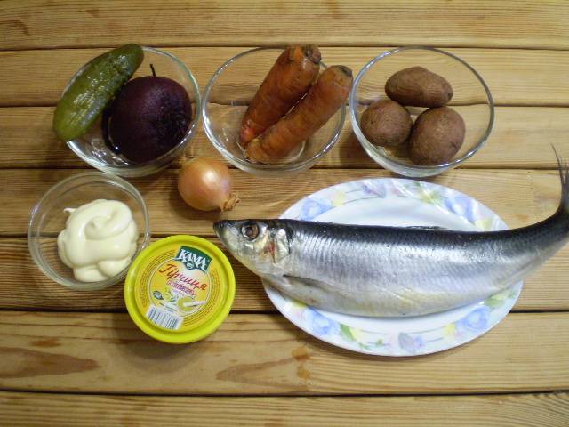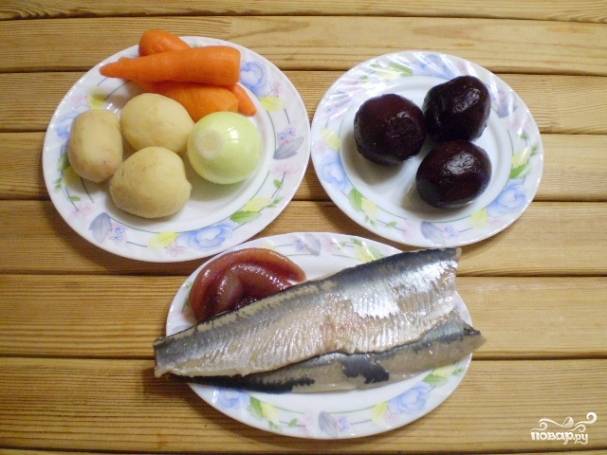 Подготовьте овощи и селедочку для салата. Отварите заранее овощи, остудите.