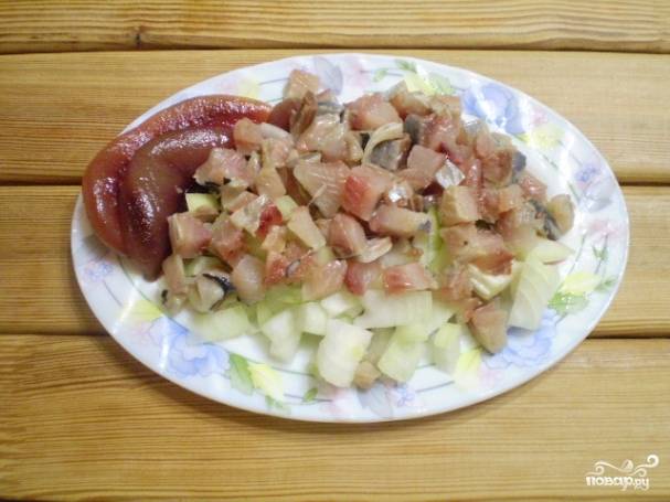 Филе селедки порежьте кубиками, лук — тоже. Перемешайте.