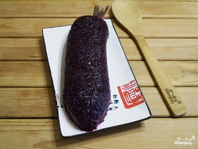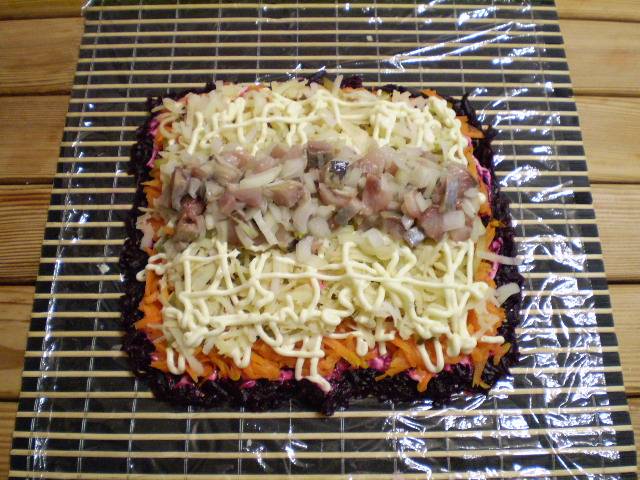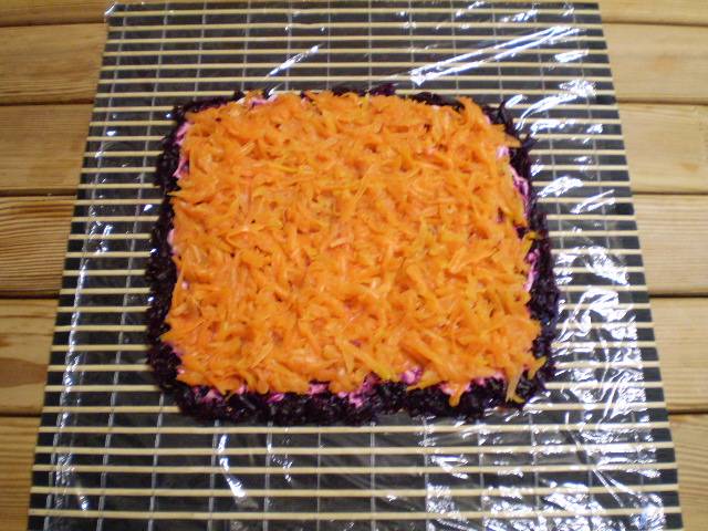 Застелите пищевой пленкой стол (или возьмите циновочку, на ней удобнее). Разложите прямоугольником тёртую свеклу. Полейте майонезом, смешанным с горчицей.