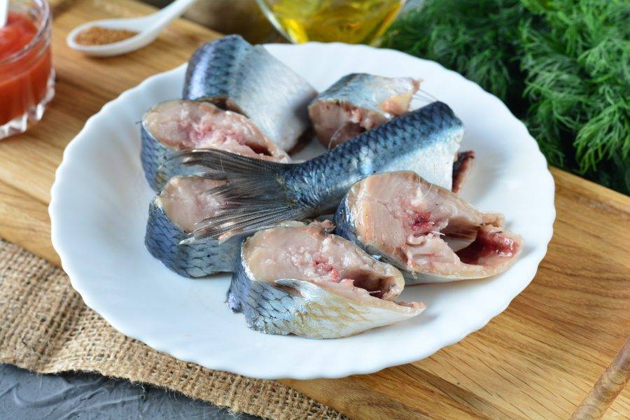 Сельдь разморозьте, почистите от головы, внутренностей и промойте со всех сторон и в брюшке. Нарежьте рыбу средними кусочками.