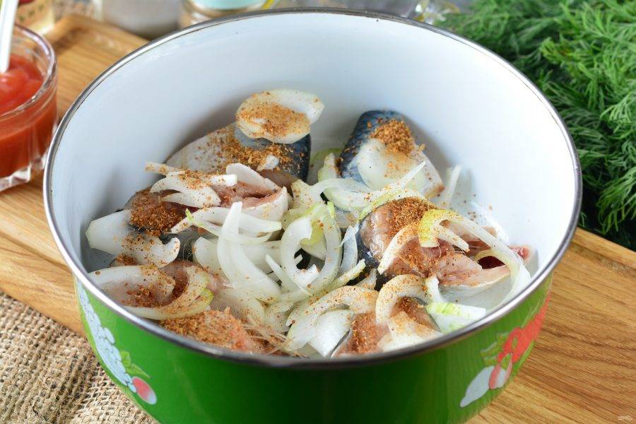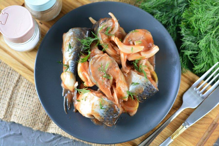Замаринуйте пикантную и вкусную селедку с кетчупом и луком. Соус придаст рыбе насыщенный аромат и вкус. С луком получится отменная закуска к празднику.