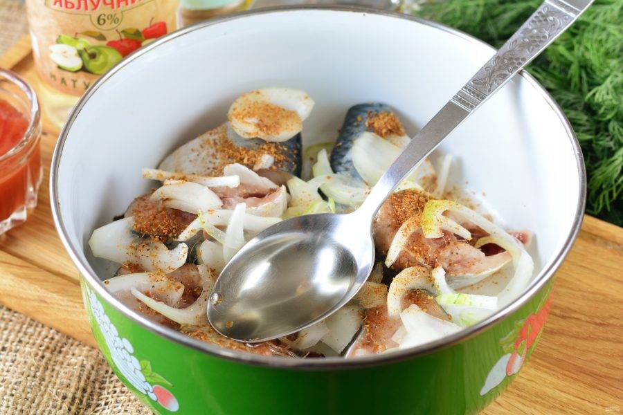 Выложите селедку в контейнер, перемешайте с луком, нарезанным полукольцами.