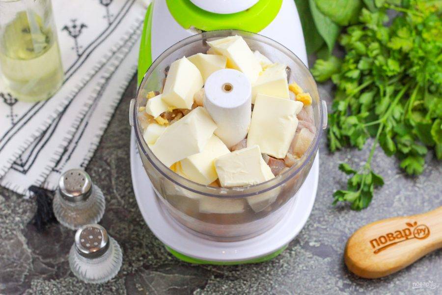 Выложите нарезки в емкость измельчителя и нарежьте туда же мягкое сливочное масло. Масло маргарином или спредом заменять нельзя!