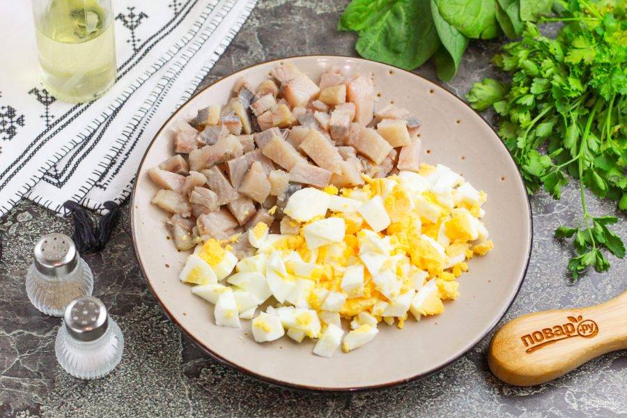 Очистите отварные куриные яйца от скорлупы, промойте в воде. Нарежьте кубиками. Филе сельди тоже нарежьте кубиками, удалите косточки, если они присутствуют.
