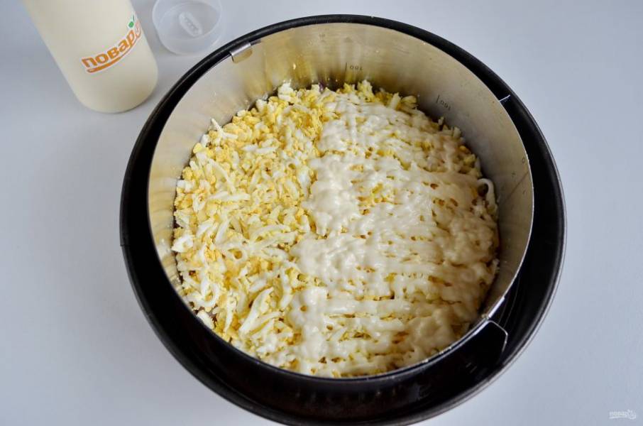 6. Далее слой тертых яиц и майонезно-сырный соус.